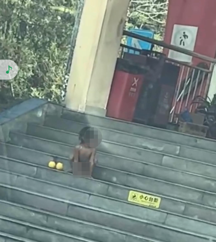 孩子一丝不挂趴在台阶上吃食物