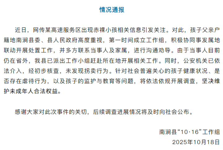 近日,网传某高速服务区出现赤裸小孩相关信息引发关注。对此,孩子父亲户籍地南涧县委、县人民政府高度重视,第一时间成立工作组,积极协同事发属地联动开展处置工作,并多方联系当事人及家属,进行沟通劝导。由于当事人目前仍在省外,南涧县已派出工作小组赶赴所在地开展相关工作。同时,公安机关已依法介入,经初步核查,未发现拐卖行为。针对社会普遍关心的孩子健康状况、是否存在虐待行为,以及孩子的监护与教育等问题,将依法依规开展调查。