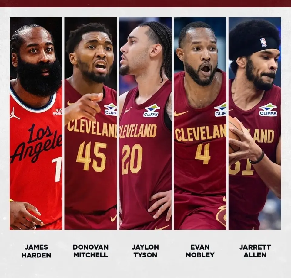 与此同时,多家美媒预测了骑士队的全新五虎:哈登、米切尔、泰森、莫布里、贾勒特-阿伦!在得到哈登之后,骑士队的夺冠赔率也得到了提升,从之前的+1200瞬间提升到+1100。而他们夺得东部冠军的概率已经提升到26%,高居东部第一位!